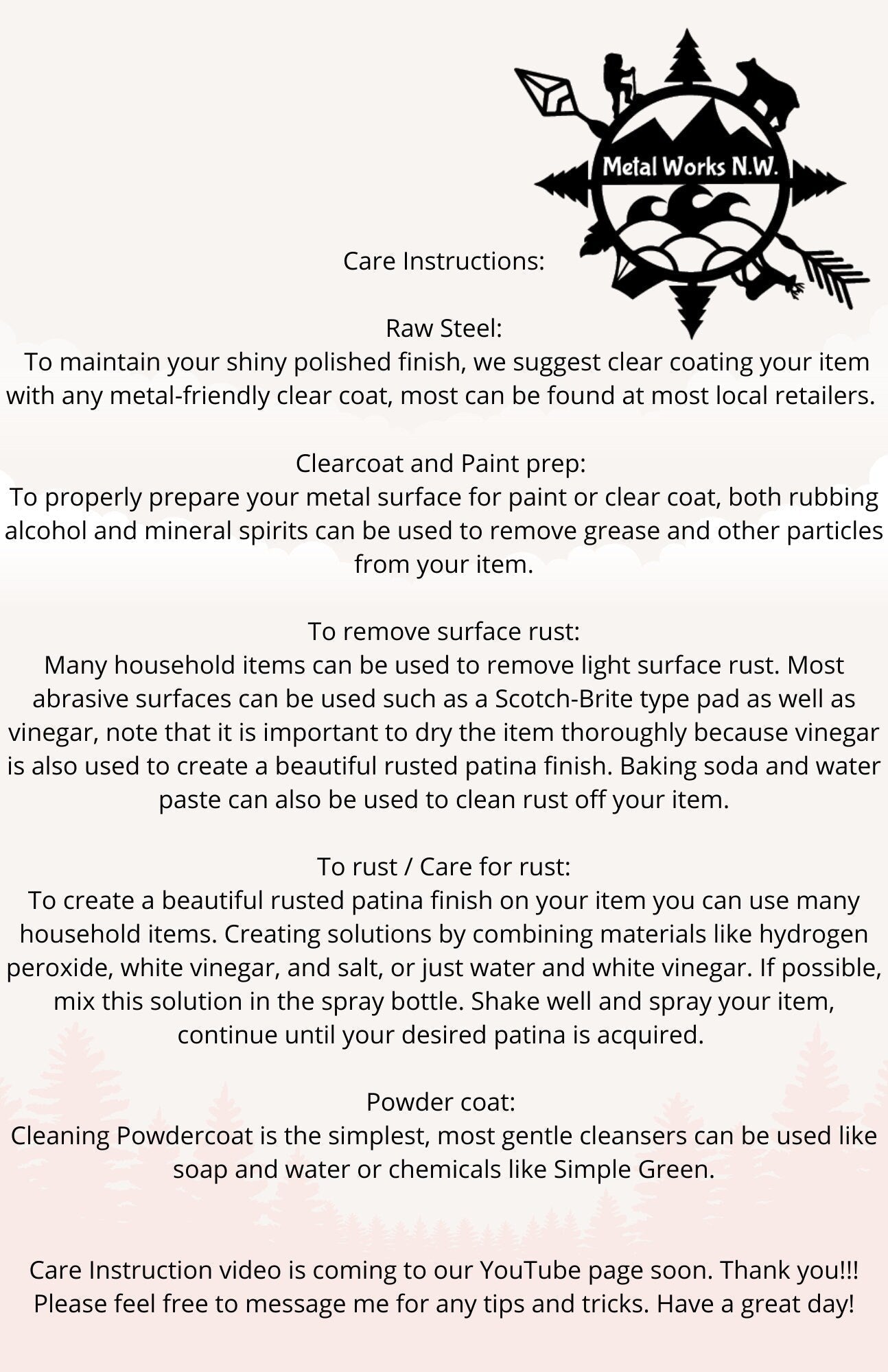 Our material of choice is 18-gauge cold roll steel, allowing us to provide a polished, silver reflective surface. To preserve its shine, a protective sealant is recommended. Alternatively, embrace the beauty of a Rusted Patina finish by exposing it to vinegar water. Care instructions will soon be available on our YouTube page.