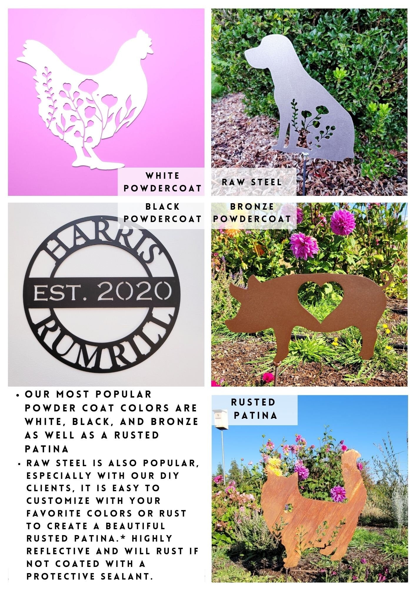 Choose from an array of finishes, including raw steel, various powder coating colors, and authentic rust. Powder coating offers a robust, UV-protected finish that is easy to clean and ensures longevity, protecting your piece from the elements. If you have specific requests for size, color, design, or material thickness, let us know – we have the capability to cut steel, stainless, and aluminum to meet your project needs. We also work with a wide range of steel thicknesses as well, ranging from 18 gauge to 1/4 plate.