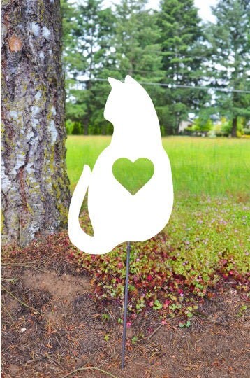 Metal Art Sassy Garden Cat with Heart Stake Decoration, Garden, Yard Art, Gift, Spring Garden Decoration, Outdoor Garden Decor, Cat Lover, Post Mount Bracket, Wall Mount w/(Holes)