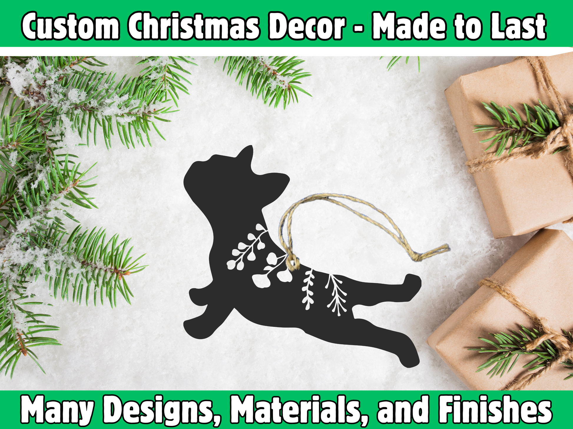 Add a touch of personalized charm to your holiday tree with this Custom Dog Christmas Ornament. Crafted from durable materials and designed to last for years to come, this ornament features a stretching French Bulldog silhouette accented with delicate floral cutouts. Its timeless design makes it a perfect keepsake for dog lovers, pet memorials, or simply celebrating the furry friend who’s part of your family.