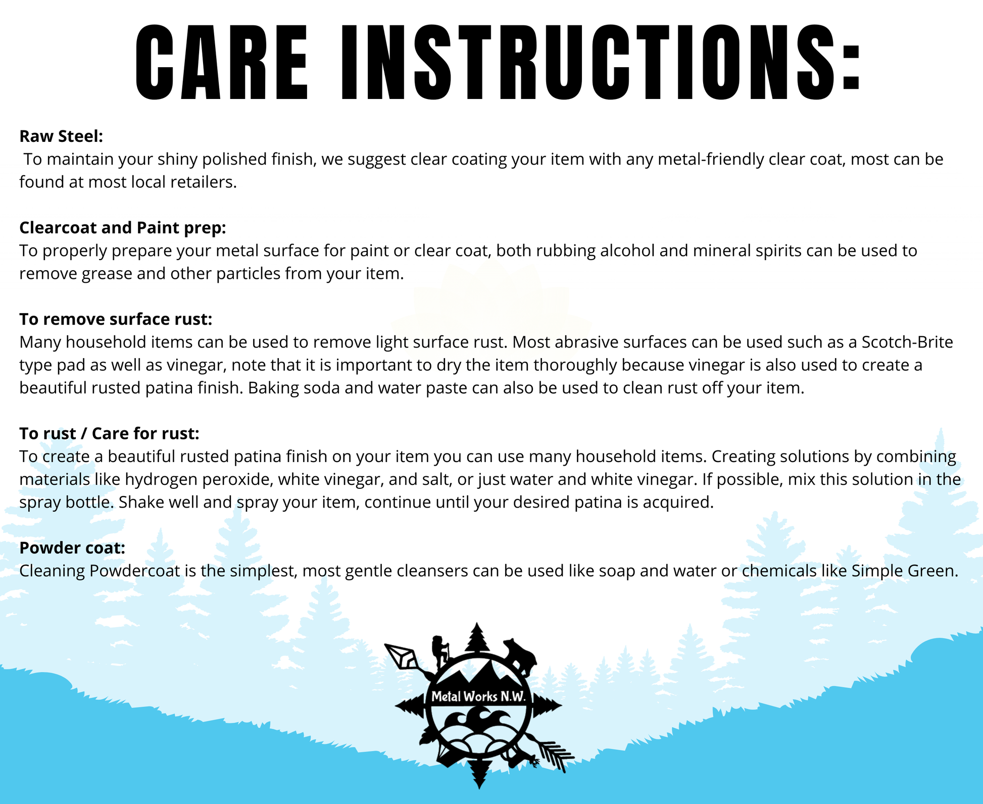 friendly clear coat. If left unprotected, raw steel will rust. For a rusted patina finish,