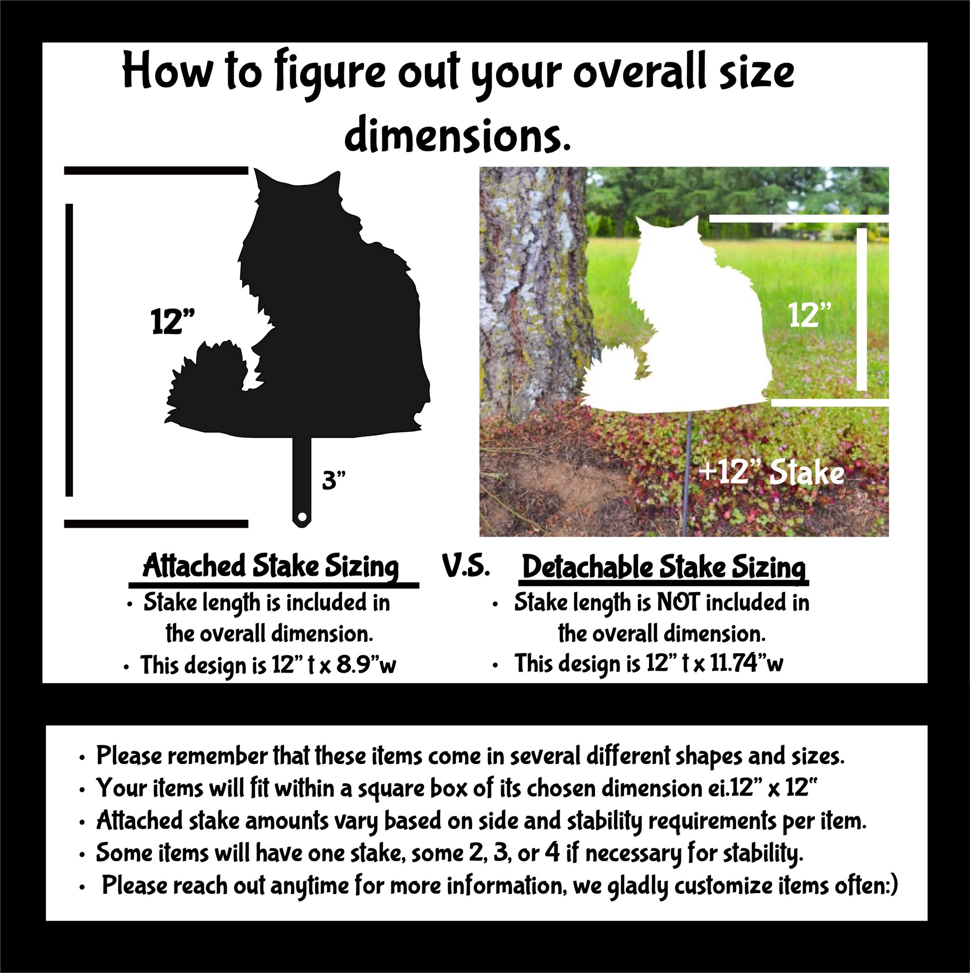 •       When selecting an item, the mentioned dimensions (nine inches, 12 inches, 15 inches, or 18 inches) indicate the overall size, including any attached stakes. This ensures the entire item fits neatly within a 12-inch by 12-inch box. For instance, a 12-inch cat with an attached stake means the item, along with its three-inch stakes, will fit within this square box, whether it's 12 inches tall or wide.